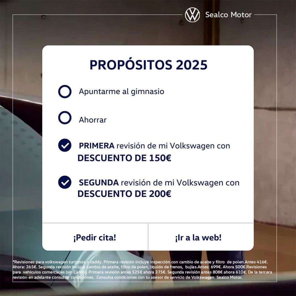 No dejes pasar la oportunidad de empezar el año cuidando de tu Volkswagen con esta campaña exclusiva de Sealco Motor. Si quieres aprovechar unos precios únicos y la calidad del servicio oficial, sabiendo que tu vehículo estará siempre en las mejores manos, puedes reservar tu cita ahora y hacer que este propósito de año nuevo sea una realidad visitando la página web de la campaña.